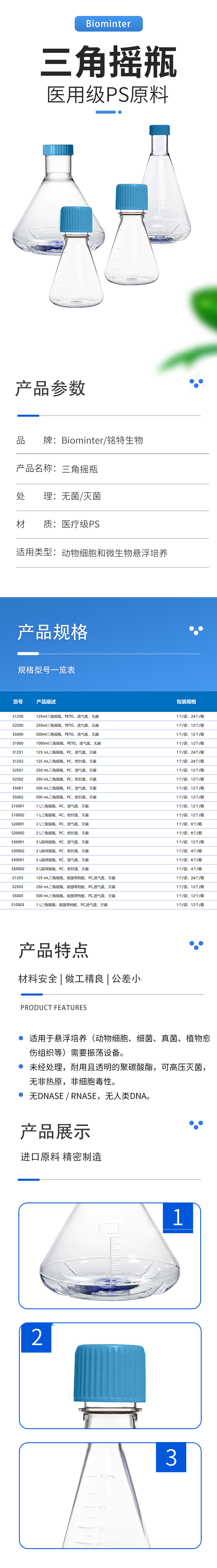 500 mL三角摇瓶,底部带档板,PC,透气盖,灭菌